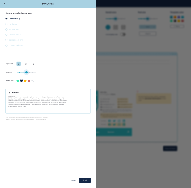 The Apps icon has various different features to add to your signature - click on ‘Disclaimer’ option